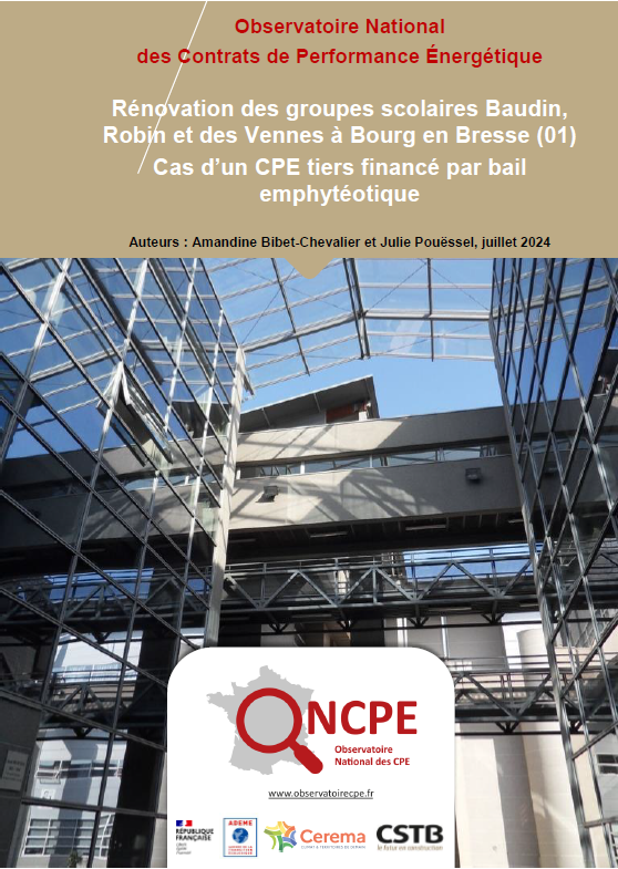 La ville de Bourg-en-Bresse mène une réflexion politique sur son patrimoine immobilier depuis une dizaine d’années. Les écoles ont été identifiées comme prioritaires dans la mesure où elles présentaient les consommations les plus importantes et étaient de surcroît occupées par un public sensible. La décision a donc été prise de rénover l’ensemble des écoles de la ville, petit à petit, par contrat de performance énergétique. La présente étude donne à voir les démarches de la collectivité pour mettre en place et suivre le CPE concernant les 2 groupes scolaires Baudin et Robin ainsi que l’école des Vennes, notamment en termes d’accompagnement technique et juridique. Les résultats en exploitation et le retour d’expérience du maître d’ouvrage sont exposés. Ce document montre ainsi un exemple de massification de rénovation d’écoles, notamment en termes de prestations et de sensibilisation des occupants. Le mécanisme de financement par un tiers (la SPL OSER) est également brièvement présenté.